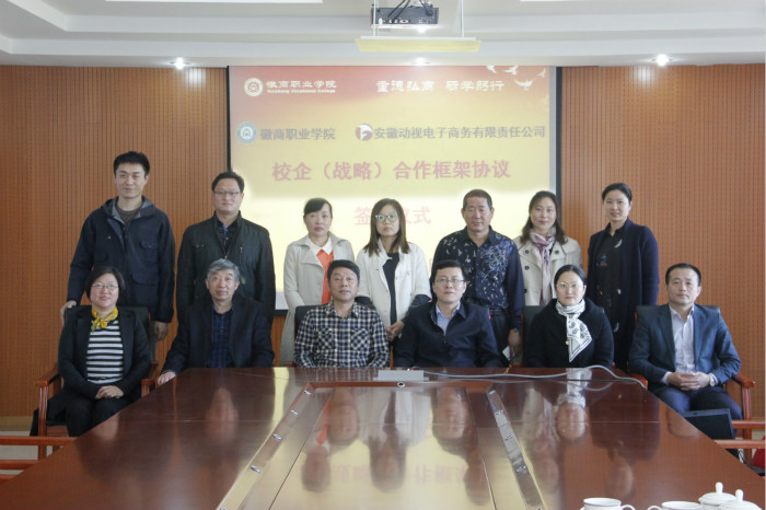 2017年4月13日下午, 徽商职业学院与安徽动视电子商务有限责任公司“校企(战略)合作框架协议签约仪式”在紫蓬校区知新楼四楼第三会议室隆重举行。安徽广电海豚集团有限公司总经理张爱华、安徽动视电子商务有限责任公司总经理陆晓慧、安徽广电移动电视有限责任公司副总经理孙明光一行7人;徽商职业学院院长、党委副书记张韶,院长助理兼学生处处长许成玉,院长助理兼教务处处长王方,电子信息系主任张玉荣,招生就业办公室副主任时军林,团委专职副书记许花出席了签约仪式,学生干部代表30人参加了仪式。签约仪式由许成玉主持。