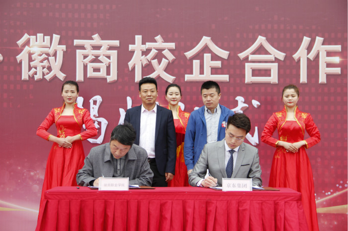 2017年4月26日,京东·徽商校企合作项目揭牌及京东集团—物流类院校产教集团倡议发起仪式在徽商职业学院紫蓬校区举行。中国物流与采购联合会周雪松女士、安徽省职业与成人教育学会常务副会长张培银、安徽省物流与采购联合会副会长周保昌、苏光友等行业学会领导,京东集团校园业务总监张晓晨、京东全国客户服务中心校企合作总经理杨程、京东华东区人力资源部总监曲来国等京东公司领导和代表,湖南现代物流职业技术学院院长邓德艾、陕西铁路工程职业学院党委副书记(纪委书记)杨云峰、武汉交通职业学院副校长梁世翔等物流行指委校企合作专委会与会领导和代表,以及徽商职业学院院长张韶、副院长窦永林、各部门(系部)负责人和学生代表参加了仪式。