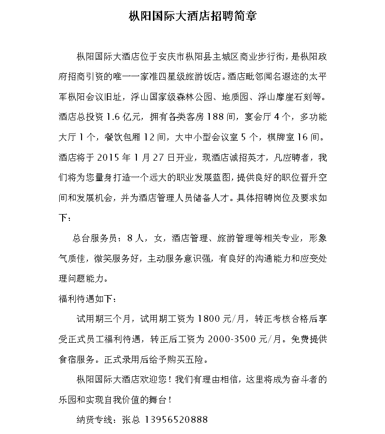 枞阳国际大酒店招聘简章