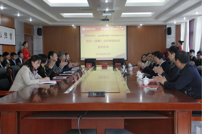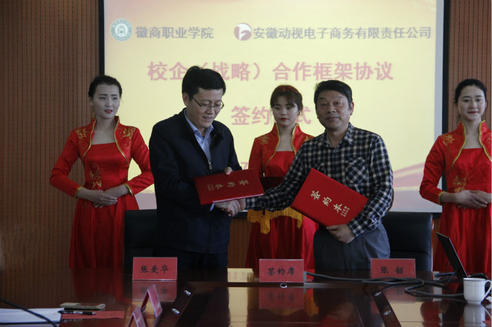 2017年4月13日下午, 徽商职业学院与安徽动视电子商务有限责任公司“校企(战略)合作框架协议签约仪式”在紫蓬校区知新楼四楼第三会议室隆重举行。安徽广电海豚集团有限公司总经理张爱华、安徽动视电子商务有限责任公司总经理陆晓慧、安徽广电移动电视有限责任公司副总经理孙明光一行7人;徽商职业学院院长、党委副书记张韶,院长助理兼学生处处长许成玉,院长助理兼教务处处长王方,电子信息系主任张玉荣,招生就业办公室副主任时军林,团委专职副书记许花出席了签约仪式,学生干部代表30人参加了仪式。签约仪式由许成玉主持。
